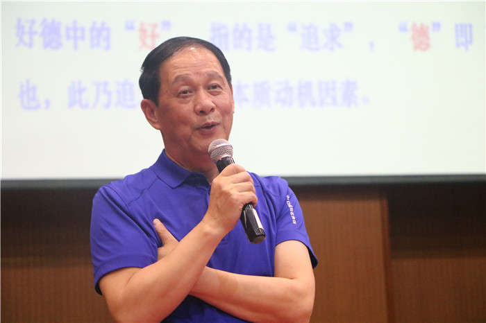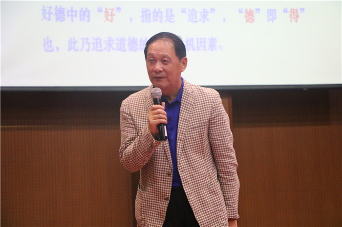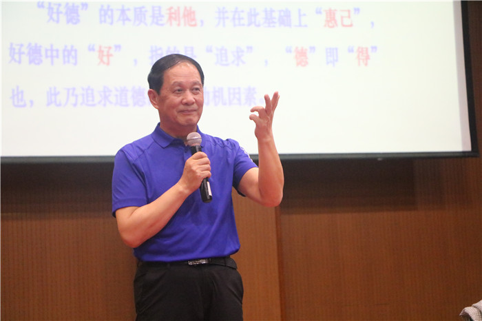 王晓均教授为我们讲解了关于道德的两个方面内容。第一是:中国文化中“道德”的含义。“道德二字我们应该分开看,所谓‘道’,指的是规律”。老子曾经说过:“道可道,非常道”,是指“道”是宇宙天地万物之奥妙的总门,“道”是洞悉一切奥妙变化的唯一门径。比如自然规律、社会规律、做人修己之道。“所谓’德’,指的是顺应规律行事。比如天人合一,中庸之道,天道酬勤,君子之德。”而它们合在一起呢,也就是道德,又有三个含义:一种社会意识形态,合乎道德的;道德是通过行为规范和伦理教化来调整个人之间、个人与社会之间关系的意识形态;社会意识形态之一。所以道是方向,德是修养和行为。道贵在感悟,德于内贵在培养,于外贵在修为。人无道则缺乏生命方向,人无德则举止无形。