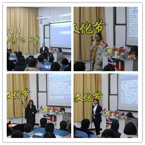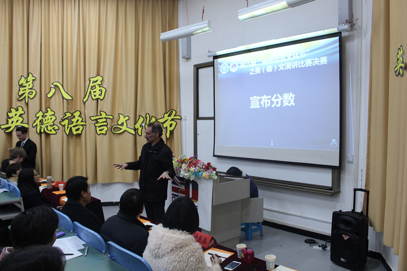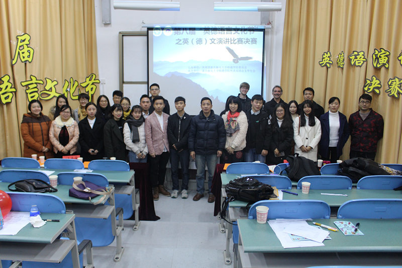 2016年11月28日下午18:30,由外国语言文学系承办的第八届“英德语言文化节”之英(德)语演讲比赛决赛在菩提书院阶梯教室隆重举行。大赛邀请了外语系主任吴世银教授、张旭宁老师、卢镜囡老师以及外教Clive作为英语组评审,德语专业李梦雅老师、齐菲菲老师、外教Peter等作为德语组评委。