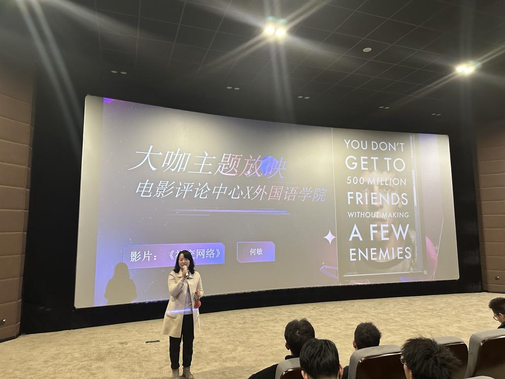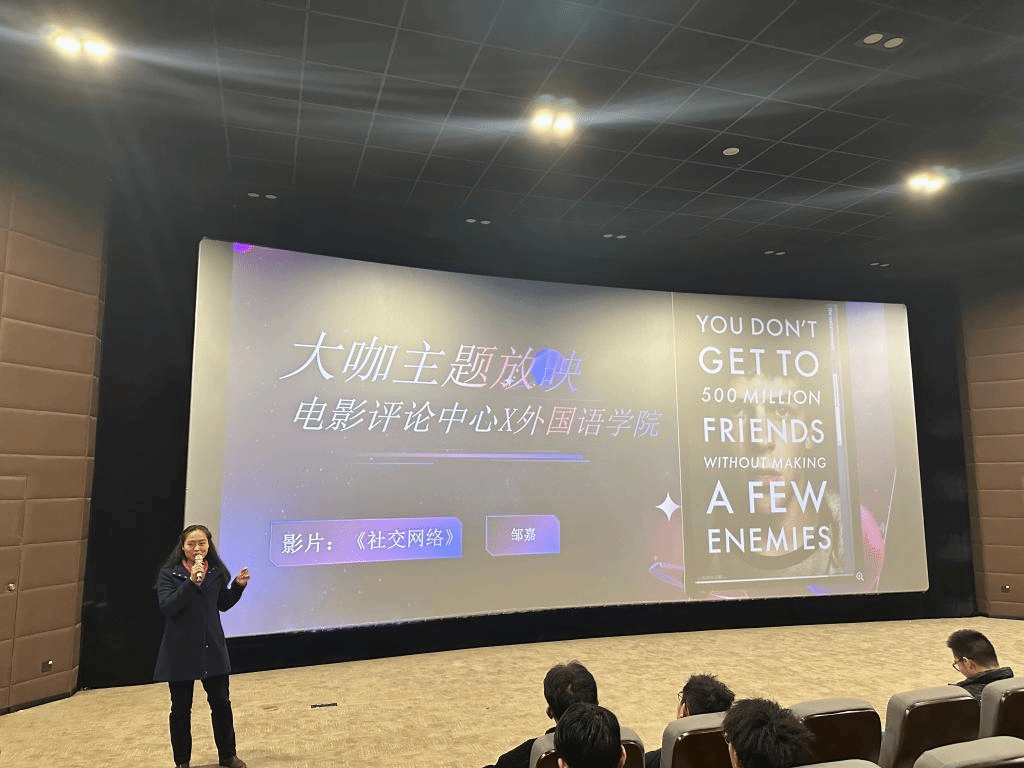 新学期伊始,外国语学院与电影评论中心融合开展大咖主题电影放映活动。3月1日下午18:00在装修一新的六度空间8 ½电影放映厅,一部由大卫.芬奇执导,关于Facebook诞生及其创始人扎克伯格的影片《社交网络》拉开了本次活动的序幕。
