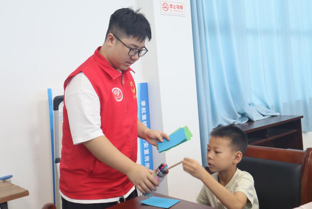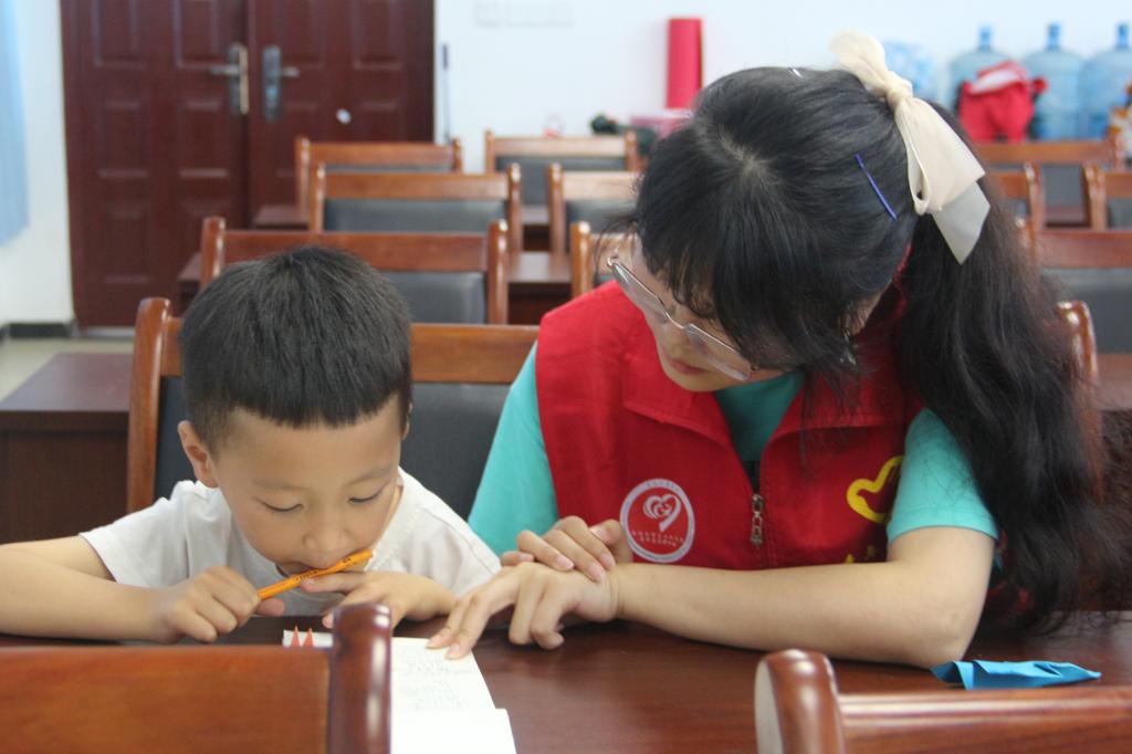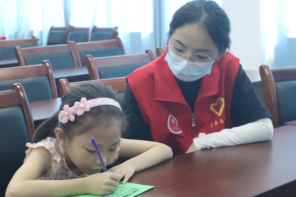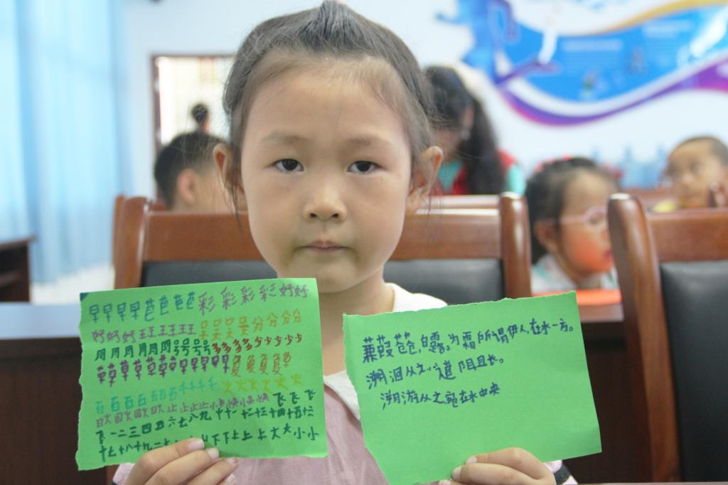 学习的过程中,不仅需要做到认真听讲,自主练习也是必不可少。志愿者在课堂上开设练习作品环节,以学写生僻字为中心,进一步让小朋友们熟悉诗词,并协助小朋友们在纸上对经典诗句进行摘抄书写。书写的过程中,小朋友们对诗词也提出自己独特的见解,“知书拾穗”成员们针对见解进行细心解答,让经典能牢记在沙南青禾的心中。
