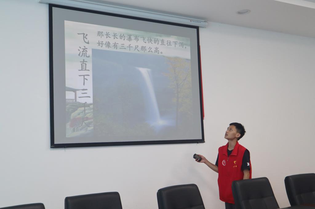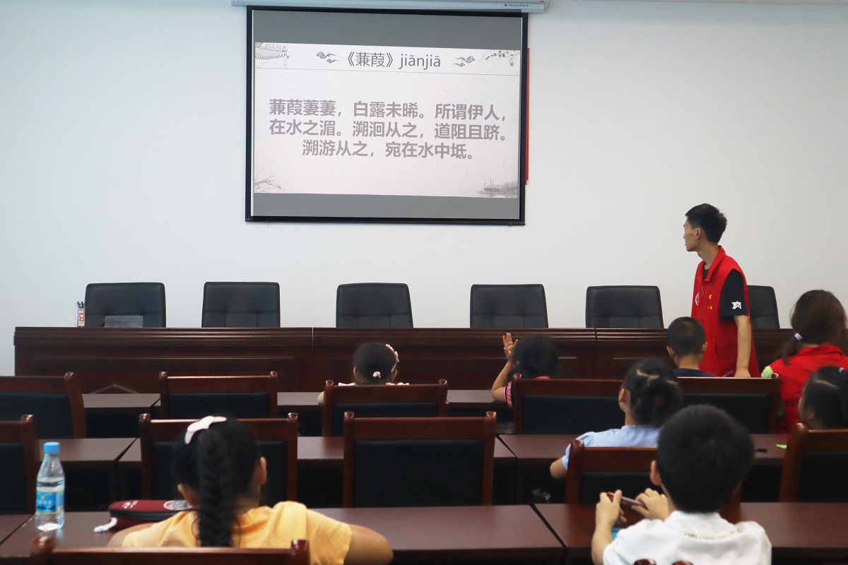 在浩如烟海的诗歌总集中,志愿者们选取《蒹葭》、《绝句》、《早发白帝城》等四首国学经典的诗篇,志愿者选其精华部分进行讲解,让小朋友们从学习认识生僻字到完整朗读,在志愿者的耐心引导下,小朋友们逐渐熟悉这些诗词的基本内容,并领会了其内在的精神价值,“知书拾穗”将国学经典传送给每一位沙南青禾。