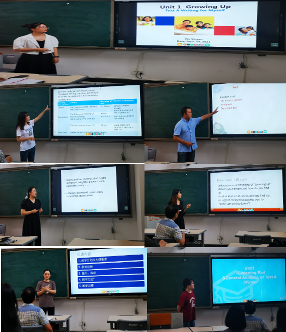 说课活动在热情洋溢的氛围中开始,七位教师分别上到讲台展示了他们的课程设计。各位老师的课程设计特色分明。龚思月老师和蒋娜老师的课程设计非常完整,从整体的教学目标、教学计划到具体的教学步骤的实施都有着严密的安排;卢俊婷把知识点引入到更深的情感、价值、人生态度,能够引起学生的共鸣;伍世艳老师在设计课堂提问环节时问题层层深入,有递进的层次感,由浅入深,令人印象深刻;朱英和王小娟老师注重听力和阅读技能的培养;冯哲君老师则把课程思政和美国梦这篇文章讲解结合起来,巧妙地以辩证的思维提出了中国梦的观点。