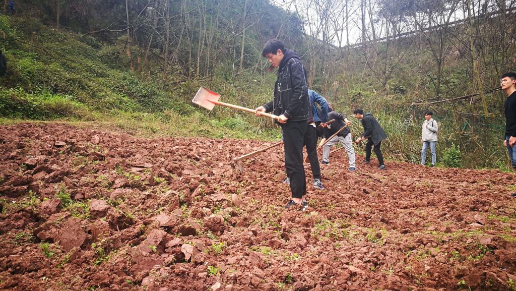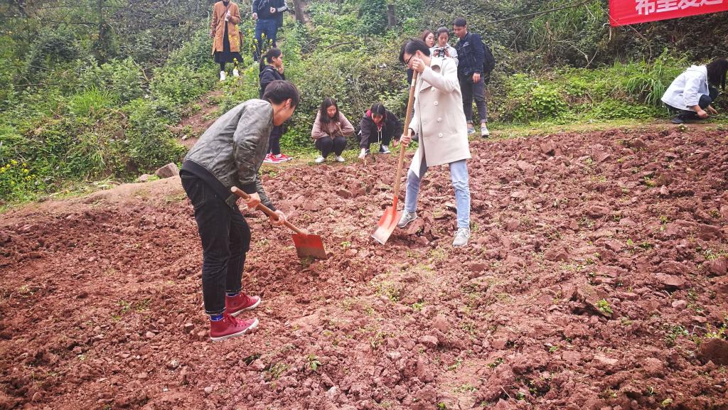 (社员们正在月亮湾里除草松土)