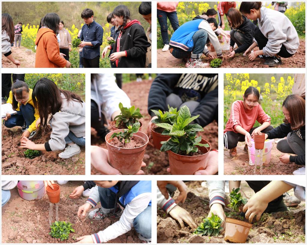 (社员们扦插栀子花并浇灌水分)