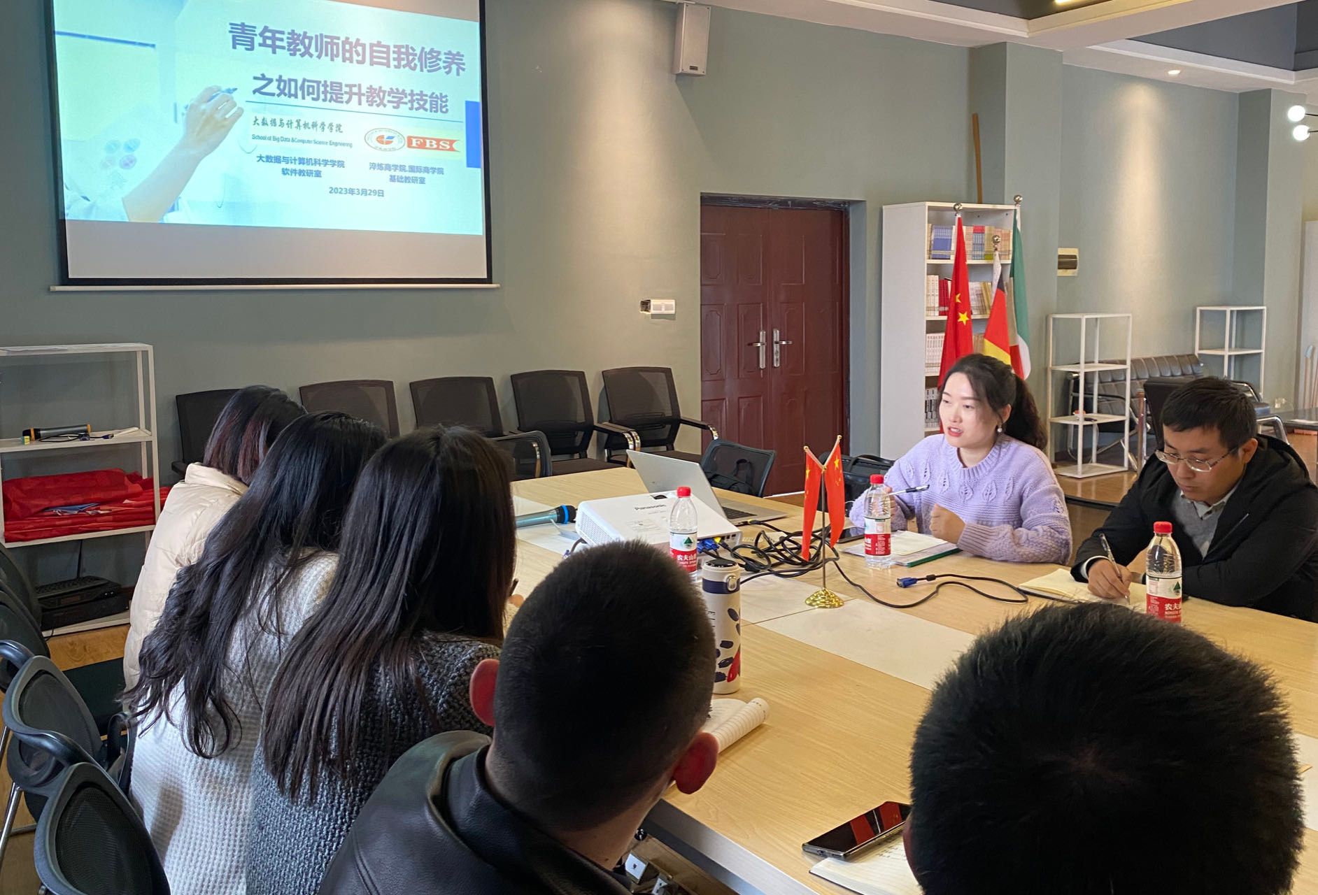 为贯彻学校四位一体人才培养模式,落实信息技术与商科教育在教学全过程中的融入与渗透,加强专业教育与商科教育的深入融合,加强青年教师的自我修养,切实提高教学技能,淬炼·国际商学院基础教研室联合大数据与计算机科学学院软件教研室于3月29日14:30在5教5楼商学图书馆开展了以“青年教师的自我修养之如何提高教学技能”的主题交流活动。软件教研室主任邓秋菊、创新中心竞赛指导人赵凤龙、吴晓庆、廖春梅3位老师,淬炼·国际商学院基础教研室全体教师参与交流。本次交流主要围绕信息技术与商科融合的探讨、一流课程建设经验的分享、教师教学技能的提升三个方面展开,淬炼·国际商学院基础教研室主任李义红主持交流活动。