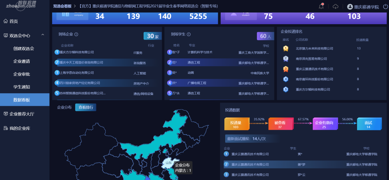 9点未到,学生们便用积极饱满的热情投入到线上双选会准备中,进入会场等待用人单位上线邀请面试,9点30活动开始,同学们踊跃投递简历,并与用人单位互动面试。其中,南京泽兆有限公司、重庆云算通讯技术有限公司等公司备受同学们关注。会后发现,此次双选会还吸引了中南民族大学、沈阳理工大学、重庆工程学院等学校的同学参加。