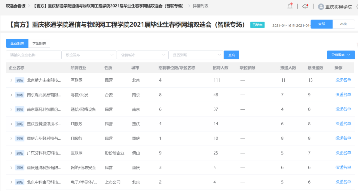 经过前期的网络宣传和邀请,本次双选会吸引了来自重庆、四川、广东、福建、内蒙古、江苏、山东等地区的近100多家企业报名,经学院审核通过34家企业参加,共计提供139个岗位,涵盖计算机、设计、新媒体、教育等多个行业。线上双选会为毕业生们提供更多就业机会,学生们可随时查看招聘企业名单,并了解企业公司简介、在招职位、企业空间等信息,更清楚地了解公司并且更好地选取适合他们的工作。