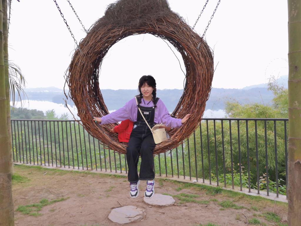 这处自然之美已沁人心脾的地方,竟还坐落着白色的小圆顶房子。鸟巢式的秋千在迎风招展下,都是动人的。浅色调的建筑物交融于远山黛影下。一闪蓝云的猝然降临,使得山水间的地平线更贴近了些。我们走近了,便有牵着孩童的家长来来往往。有在草地上牵引着风筝线的,有从小贩那儿买了泡泡水的,还有一群小孩呼朋唤友,占了一处长秋千,正卖力地推着秋千往天边荡。乍然一看,童真,时节,都一齐出现在这个小小的天地间了。与山水间行走的感受不同,在那边,我们是旅客,在这边,我们又像是带着餐布的春游闲客。坐在草地上,旁边穿着碎花裙子的小女孩便迎着风筝跑过。如若思绪不在此处,在云层深处,也仍能闻到青草的芳香。