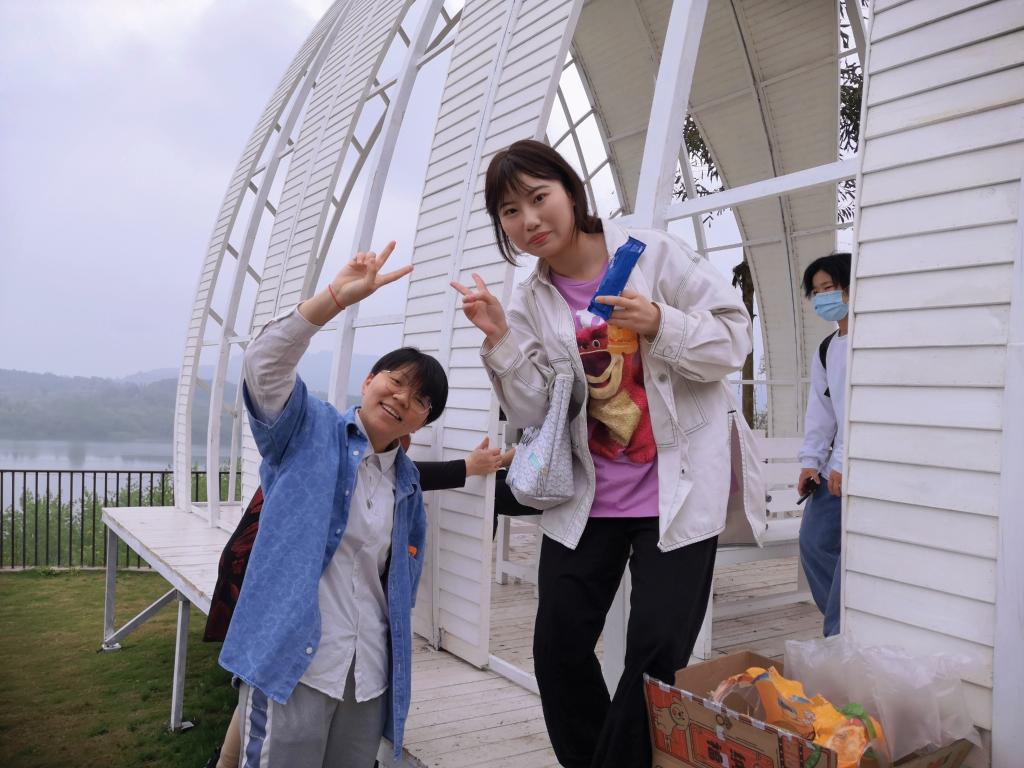 同学们都把自己拾掇得清清爽爽的,一张张笑脸应景芳菲四月天,这样的“教室”爽歪歪。眼前,湖天相对,中间是山。一览不尽的水面清粼粼的,在我们初到时便油然而生一种澄澈的碧蓝色。余光中先生曾写过,山什么也不会说,只是鸟雀争噪泄露了他愉悦的心境。我们此刻身处于这片小山坡上,任鸟飞,任目光展怀于水面之上的浮萍,便已是身在其中的旅居之客。湖又围着山,山又围着我们。
