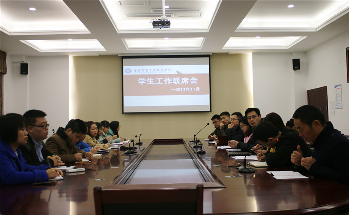 11月28日上午9点,由学生处牵头的11月学生工作联席会议在行政楼107会议室召开 ,参加会议的有学院院长助理周伟、院长助理刘枚、学院办公室、学生处、团委、保卫处、后勤处等部门负责人及各院系学办主任,会议由学生处副处长陈帅主持。