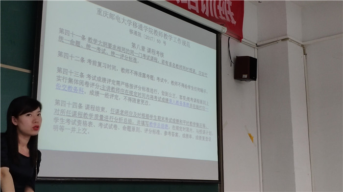 本次文件学习会议主要回顾和学习了《重庆邮电大学移通学院教师教学工作规范》,《教学事故认定级处理办法》,《关于学生平时成绩计算方法的规定》,《“学评教”工作实施办法》,《课程考试管理规定》,《试卷评阅及管理工作》,《考试违纪处理程序》等七大学院教学管理制度,再次强调了教学规范,教学工作严谨、认真的重要性。