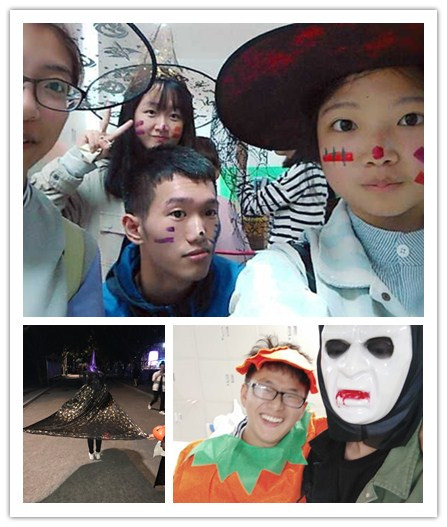 当然也有很fashion的小伙伴们,他们提前画好了万圣妆,关上灯,门微开,当我们敲门而入的时候,他们躲在门后静待时机,突然出现在我们面前说一句“Happy Halloween万圣节快乐”让我们也感受到了来自他们的热情,毫无防备的情况下总少不了些许惊喜声尖叫声划过寂静的空气。笑声总能温暖一切,玩笑过后,显现的是所有人的亲密和团结友爱。
