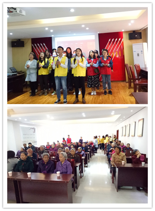 斜阳撒在地板上,红与黄的身影穿梭在老人身边,让这原本以暗色调主打的会议厅变得格外温暖。一切准备就绪,台上主持人幽默的主持风格,逗得老人们咯咯直笑,紧接着的开场舞活跃了现场氛围,虽然爷爷奶奶都是上了年纪的人,可是年轻的心态仍在,看着一群朝气蓬勃的年轻人,他们仿佛也年轻了不少。张爷爷是社区里的名人,他被邀请到台上发言。他借用《社会主义好》《坚持到底》的内容表达着自己的信仰,爷爷说:“现在生活好了,还有大学生送温暖到家,我们这群老家伙可不能落后,得好好学习,现在科技发达了,我们也要跟上时代的步伐!”在张爷爷的号召下以及志愿者们的走心表演后,老人们也变得越来越活跃,与我们一起共享这个美好的“黄”金时刻。