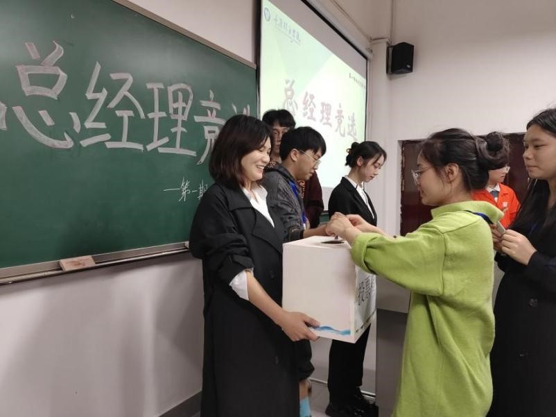 经过五位竞聘者精彩绝伦的自我展现,台下的评委老师和学员们经过深思熟虑,选择了心目中的最佳人选,郑重地将票放入投票箱,随后两位监票员进行票数公示。由双创导师王颖珠老师宣读票数,最终刘昕宇学员以42票的成绩,成功当选总经理一职。王颖珠导师对其竞选成功表示祝贺,并寄愿总经理可以作为帆船之掌舵人,引领学员们乘风破浪,勇往前行。