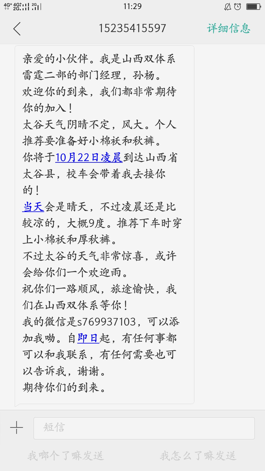 10月22日凌晨4点,刚出站台迎来的便是山西双体系职场经理殷少华老师带队的山西双体系代表团,山西同事们热情的接过大家手中的行李,不断传来一声声嘘寒问暖的话语。太谷的凌晨是寒冷的,但山西双体的同事们用热情驱走了这份严寒,这一刻,同事们的心里是暖暖的。转瞬间到了宿舍门口,第二波热情洋溢的山西同事们便带领我们来到即将生活两个星期的宿舍。推开门,映入眼帘的是整齐干净的内务,一尘不染的地板,叠得四四方方的被子,和为每一位同事精心准备的爱心早餐,虽身在异地,但同事们却体验到了家的温馨。