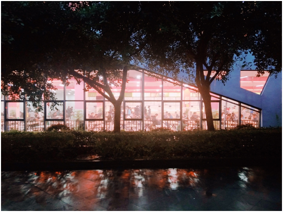 俯瞰山下景色,远处绵延的山峰,黄昏时分绚烂多姿的彩霞,蓝天下清澈见底的泳池,都为朦胧的天空增添了一抹亮色。近看宿舍楼前伫立着一排排枝繁叶茂的高大绿墙,树冠与树冠抄着手形成一排天然的绿伞,风一吹树叶沙啦啦作响,伞下三五成群的人或聊天或打闹或对弈伴着孩童天真的嬉戏。