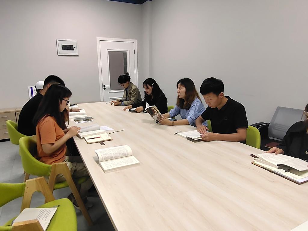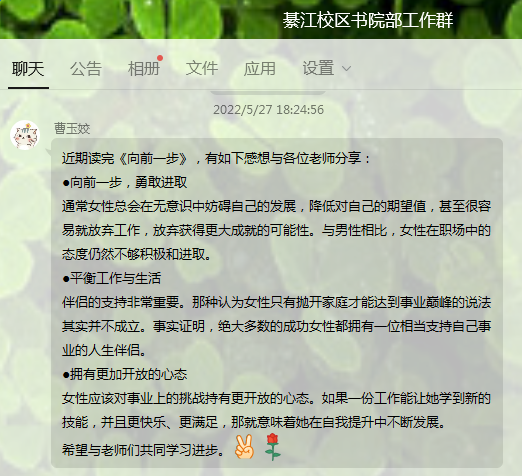 书院部(綦江校区)5月27日全体教师于綦河书院学生组织办公室开展了大咖阅读分享会。10位教师围绕《向前一步》开展阅读,阅读后全体教师就感悟与体会进行了分享交流, 每个老师都仔细刨析人物背景,将书中对自己启发最大、 触动最深的部分分享给大家,并将读书笔记发到QQ工作群共勉。以点带面,形成全校共同推进大咖阅读计划, 让书香飘在校园的每一个角落。