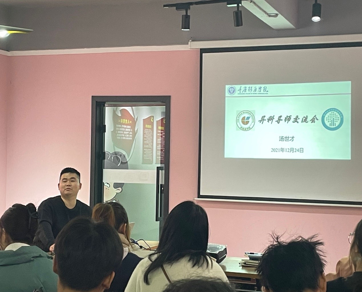 全生异科导师制是学校全新的育人机制,旨在全方位的促进学生成长,拓展学生知识面,实现不同学科之间的有机融合。为了丰富同学们知识面,拓展视野,增进异科导师与学生之间的互动交流, 12月25日下午16:00汤世才老师在爱莲书院语言交流室有序开展了异科导师交流会。