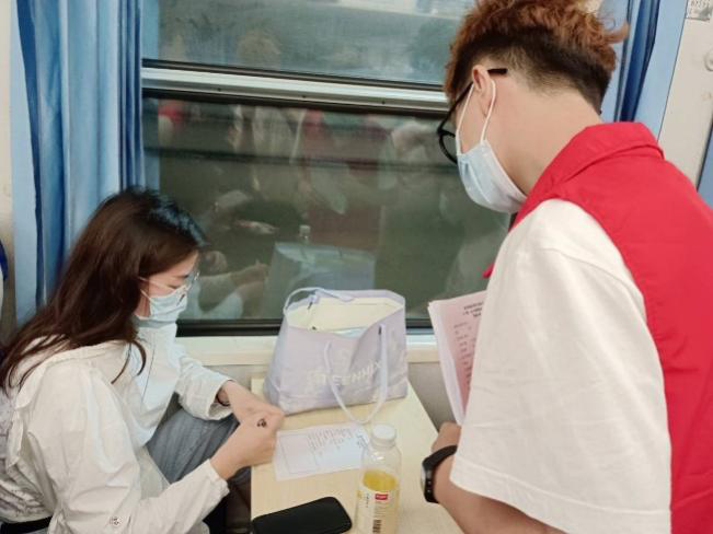 登上开往酉阳的列车一路向东,沿途翠绿的群山、蜿蜒的河流、蝉鸣的农田,无不让人心旷神怡。随着这般窗外优美的景色,实践团在列车上对乘客展开了细致的调研。队员们穿着“红马甲”在列车里穿梭,不停地在人群中递送着一张张精心考量的调查问卷。填写的乘客在问卷上细致地勾画,大家的一笔一画,都是对实践团最大的支持与帮助。