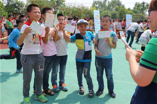 为了鼓励小朋友积极参加游戏,每个小朋友手上都有一张提前发放的游园卡,通过一个游戏,就可以在工作人员处盖章认证,在游戏结束的时候凭借游园卡认证领取相应的奖品。结合东渡小学的校训:爱心、养心、善心,很好地将学校的“三心”理念融入游戏之中,使学生在活动中体会游戏的快乐并锻炼协同合作与沟通协调的能力。小朋友们在排队等候的过程中,朋友之间会互相问对方盖了几个印章,通过了几个游戏。小朋友们天真烂漫的笑容,让志愿者们看到了东渡少年的活力。