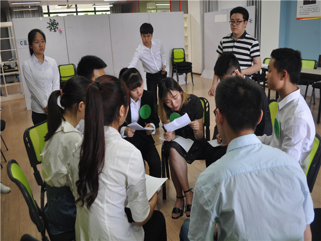 第二环节,无领导小组讨论,各位选手分成ABC三个小组,每个小组各有一个主题,根据主题小组成员阅读背景资料,集中发言,最后推选一名发言人代表全组发言。十五分钟的时间对于参赛选手来说就是争分夺秒。在指导老师的建议下,他们集中智慧,踊跃发言,此时的他们不是对手而是队友,在他们的眼里只有团队的输赢,而不是个人的输赢,团结就是力量,集中力量就是赢家。