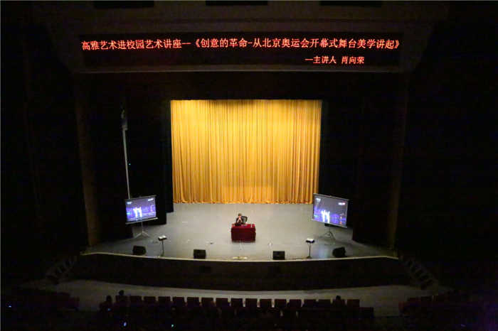 柔光一泻而下,全场的目光瞬间聚焦在舞台上。肖教授先和大家分享了关于创作“最为关键的创意是怎样来的”的一些经验。继而提到自己担任第29届北京奥运会、残奥会开闭幕式主创团队策划及导演那段时间的经历,肖教授以蔡国强在北京奥运会开幕式上的作品《燃放焰火·历史足迹》为例,强调此作品象征着第29届奥运会举办的圆满成功和中国未来的繁荣昌盛。这个创意是如何实现一个从昔日中国到现在乃至未来中国转变的呢?肖教授指出一个创意往往就能表现出一件艺术作品的张力,同时他也指出这些创意实际上就存在生活的点滴之中。教授的这个观点让在场的同学陷入对生活创意的思考之中。