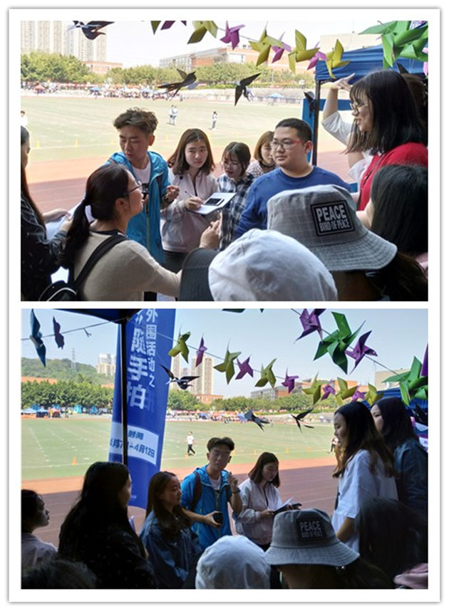 两天运动赛场上精彩不断,观众台上的也没闲着。外语系的观众更是两头忙,除了积极地给场上的运动健儿们加油打气,也积极地投身在丰富体育知识的大潮里。