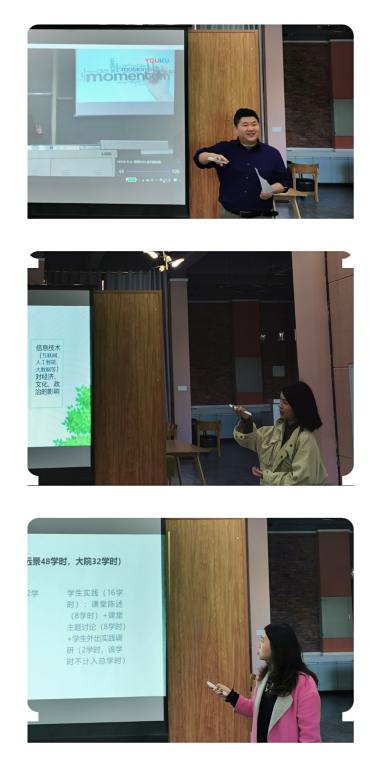 第三位是李梦瑶老师。在课程建设思路上,李梦瑶老师首先通过探讨“奔跑的人”与“奔跑的信息”之间的关系,引导学生形成思考相关问题的思维;其次是将本门课程与学校的“四位一体”相结合:专业+通识(通识内部跨学科融合)+商科+完满,并提出了相应的解决方案。在课程目标上主要是达成学习目标(培养学生的跨学科、批判思维、创新思维以及全球化视野)和实践目标(学生运用信息技术完成对某“电子信息技术企业”的商业调研)。李梦瑶老师主要从课程设计,理论层面上探讨信息技术与媒体、战争、企业及社会治理的关系这两个方面进行课程建构。