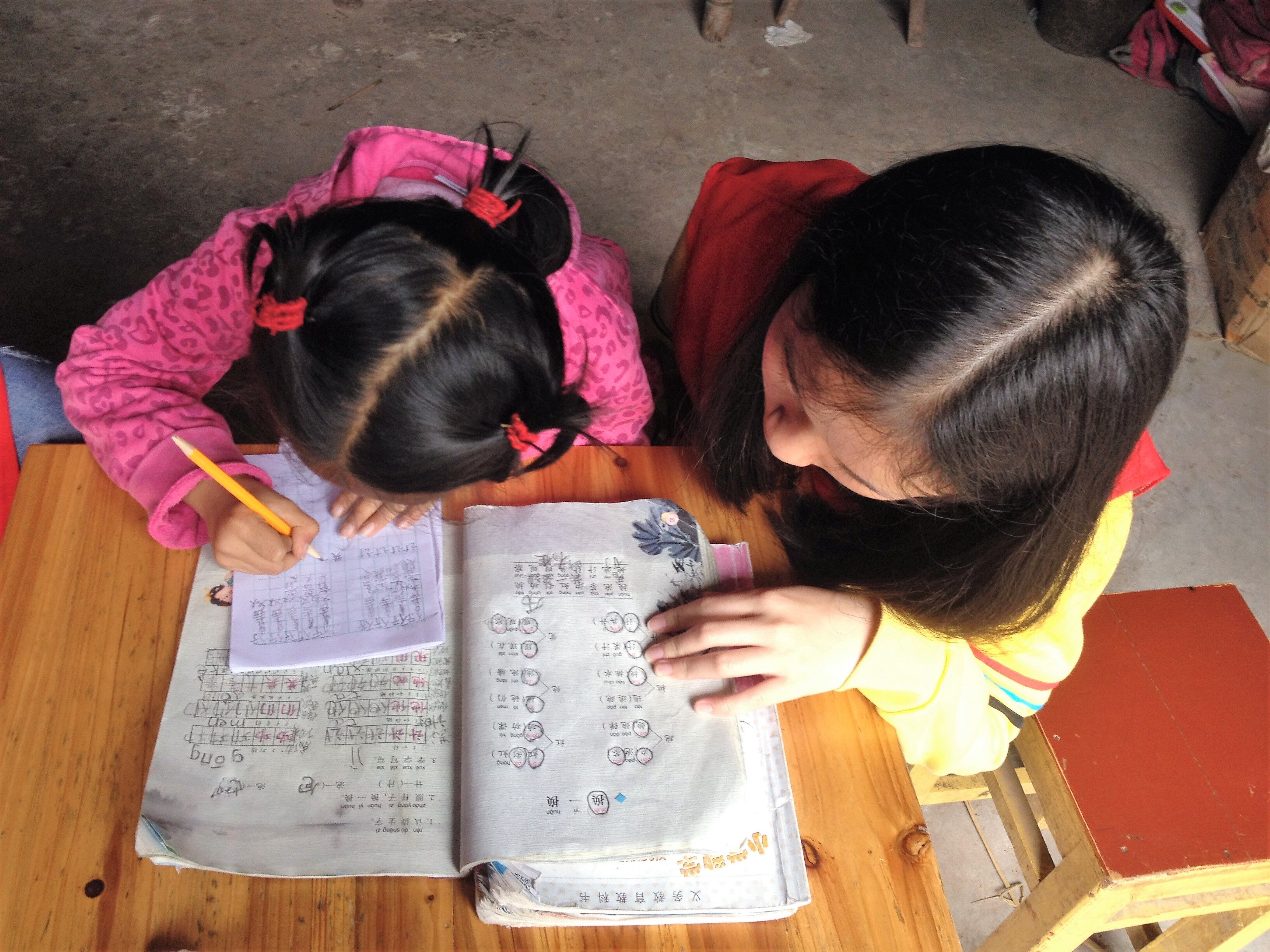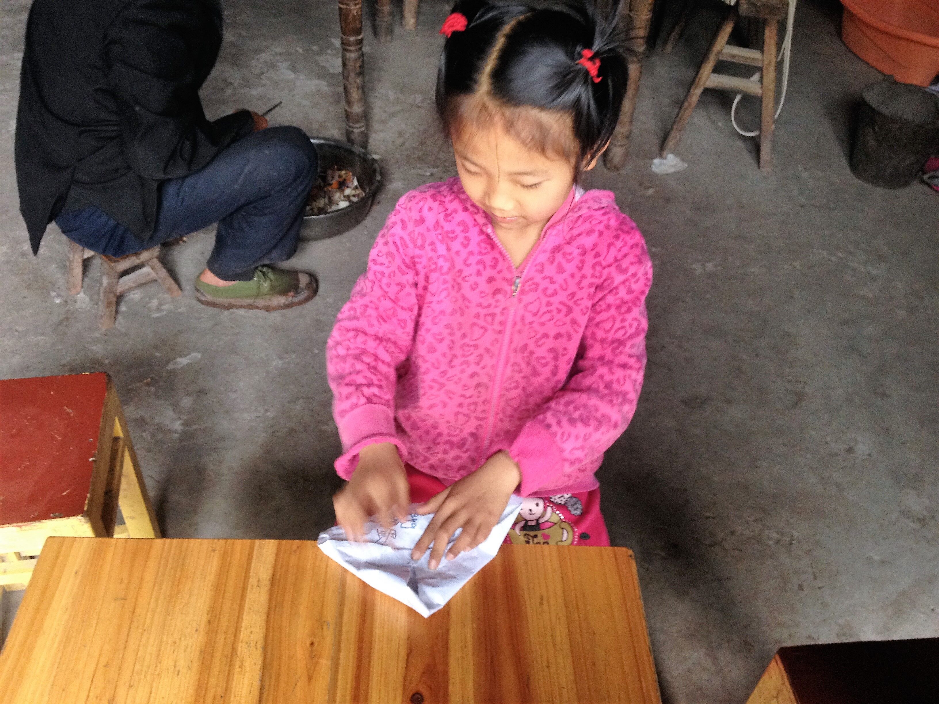 刚走进院子中,就听到欢快的歌声,志愿者慢慢的走向小羽菲面前,她看到志愿者们的鞋子后快速抬起头,害羞的看着他们,然后走到另一个椅子旁边拿出她的纸,给志愿者们折飞机,还指向外面说:“竹子在动,有人在房地修瓦”。志愿者们都很惊讶,从最开始一次只说几个字,到现在的可以跟志愿者们说这么多话,真的很令人高兴。最值得志愿者们高兴的事是羽菲今天竟然主动拿出数学作业让志愿者们教她,记得以前羽菲做数学时,她都很抗拒的。而这次一做就做了四篇两位数加两位数的练习题。