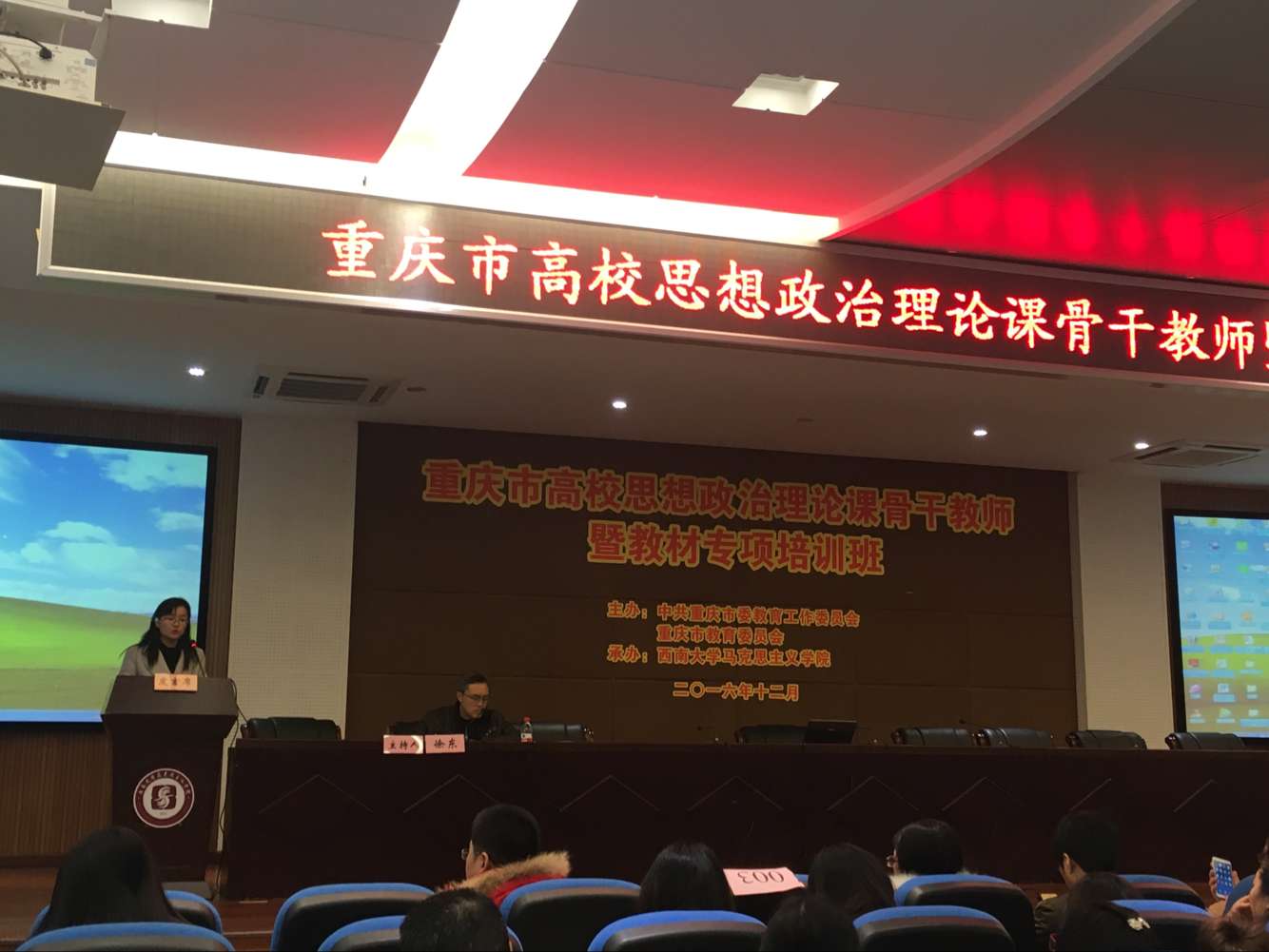 为进一步加强高校思想政治理论课教师队伍建设,提升高校思想政治理论课教育教学质量和水平,由重庆市委教育工委、重庆市教育委员会举办的2016年度高校思想政治理论课骨干教师培训班于12月19日至21日在西南大学举办,我校思政教学部7名教师参与了此次培训。