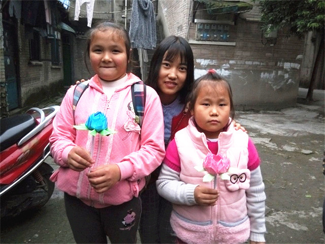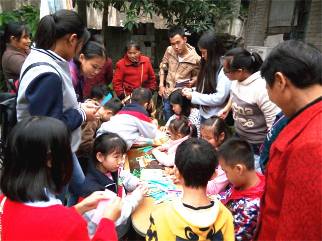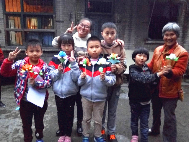 十一踏着寒流进入了我们的生活,人们纷纷增添衣物,抵御这并不惹人喜爱的寒意。但尽管寒流逼人,却没有浇灭同学们为无声孩子带来快乐的心,11月6日,手语社和DIY手工协会的社员们决定再次走进无声儿童的世界,用七彩折纸,为他们建筑属于自己的缤纷世界。 一条幽长的青石板路貌似看不到尽头,但在转角之后就到达目的地。只见小院大门紧锁,还在担心孩子们未放学的时候,一片叽叽喳喳的欢声笑语就从身后传来,孩子们回来了!可爱的小朋友围绕着我们兴奋不已,可见几次的来往已让我们成为了彼此很亲密的朋友,看着他们纯真的笑脸真切的希望今天的七彩折纸,能够为孩子们留下美好的回忆。