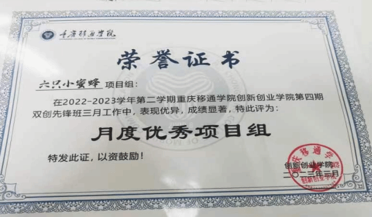 在第四期双创先锋班3月的月度评优活动中,六只小蜜蜂团队的模式和经营效果受到班级学员和老师的一致好评,荣获月度优秀项目组称号。