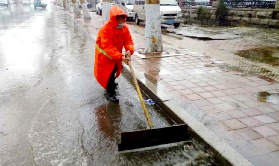 清晨,环卫工人们早早地到街上开始清扫积水,在无暇雨水的肆虐下,为了快速恢复路面交通,他们齐心协力,纵志成城。致敬可爱的环卫工人们!为他们点赞!