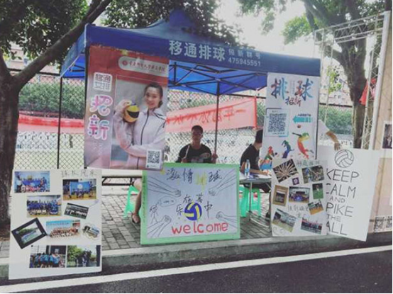 训练之后,男排队员们便马不停蹄地赶向招新点开始招新。排球队的招新宣传内容颇为丰富。手绘海报、电脑制作的海报双管齐下,左右两侧是排球队精彩瞬间的抓拍照片,当然还有还有赠送的小手扇,帮助新生缓解暑热。众多的招新棚下,若见一帅气学长端坐,眼神坚毅仿佛在说:“同学,移通排球队期待你的加入!”那必是我们移通排球队的招新点了。