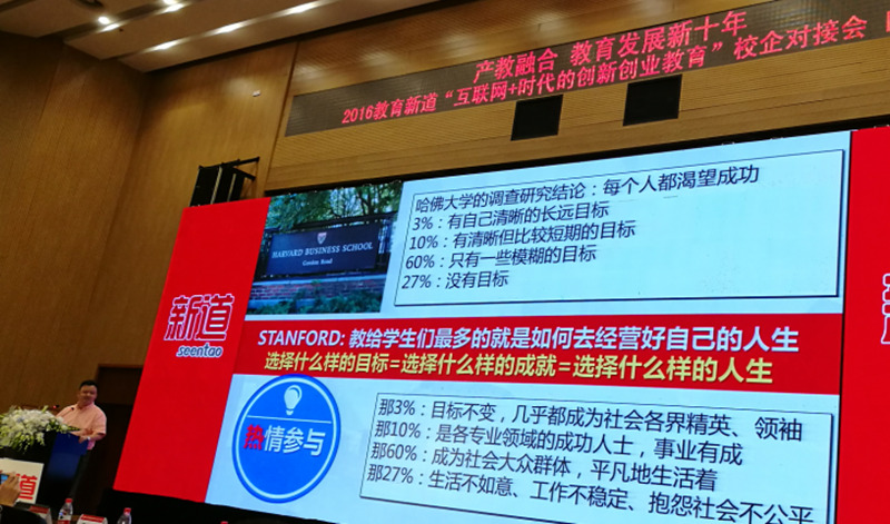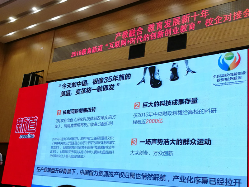 全国高校创新创业投资服务联盟的理事长在会议中从中美发展历史出发给大家讲解了国家对创新创业教育的战略重视以及相关政策导向,解读了国务院下发的相关促进创新创业教育改革的相关文件:《关于深化高等学校创新创业教育改革的实施意见》、《中共中央关于深化人才发展体制机制改革的意见》、《中共中央办公厅关于印发深化科技体制改革实施方案的通知》、《促进科技成果转移转化行动方案》等等。其意在呼吁并鼓励各高校建立健全的创新创业教育体系,增强大学生创新创业的精神和能力。