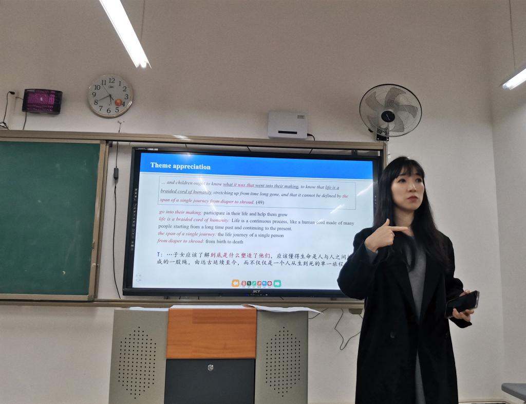 最后,卢镜囡老师结合各位老师主题分享的要点,以《现代大学英语精读3》第八单元In My Day为课程思政案例切入,指导《基础英语》课程思政团队成员深入挖掘阅读文本中蕴含的育人元素,在课堂导入、背景介绍、文本分析、主题凝练和练习巩固的各个环节融合能够潜移默化培养学生文化自信的思政“点”,将隐性的思政教育有机地融入到显性的语言教学中,以实现“听、说、读、写、译”基本技能培养和思想政治教育的无缝衔接。