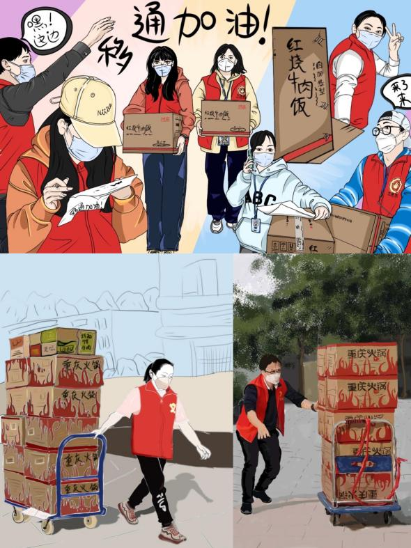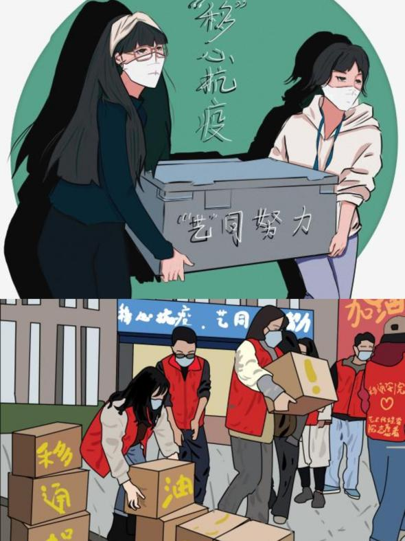 各学院老师们的挺身而出,组成志愿者协助学校进行疫情防控工作。无论是提着沉甸甸的饭盒,为学生们送饭的老师们;还是因为长时间地物资搬运,汗水早已浸透衣衫也未曾停下来休息的志愿者们,她们也成为了学生在寝室写生的热门素材对象。