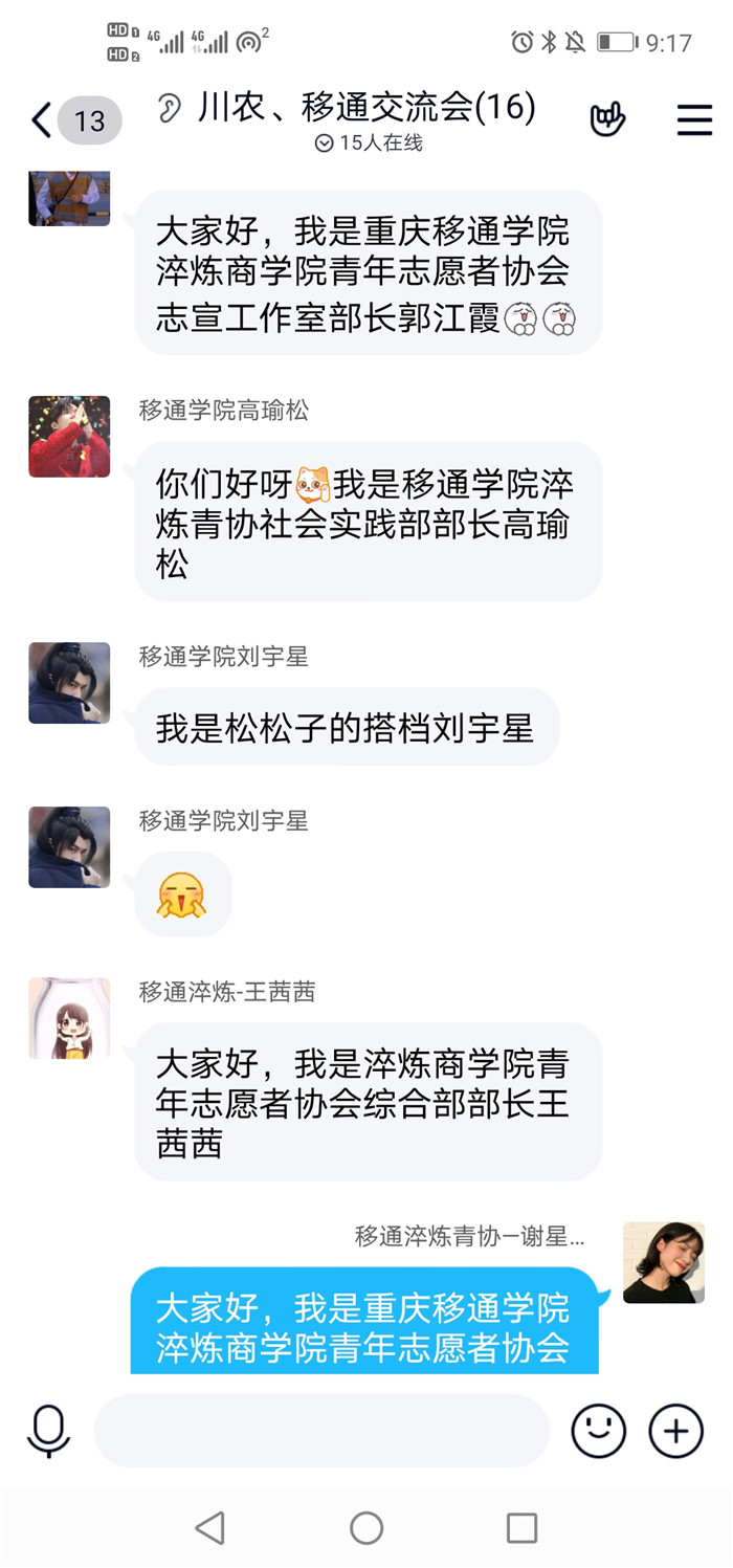 随着连续不断的“叮咚”声响起,两校的志愿伙伴们逐次“入席”,安静的通话空间骤然被一声声欢乐活泼的问候打断,对话框打出的自我介绍显得拘谨又可爱。 双方青协成员在自我介绍后开始了部门职能阐述,以便于能够更好的相互交流,了解对方长处,弥补自身短板。淬炼商学院志愿发展主要路线为1246+服务体系,而川农园艺学院更多的是针对文化传承这一志愿服务道路。在交流间,川农的小伙伴们更是向我们展示了精彩绝伦的茶艺表演和技艺精湛的压花文化。每一副茶艺照都突显着优雅迷人,每一副压花照仿佛散发着花香,让大家不自禁的投于川乡文化的洋流中!移通小伙伴也展示出了志愿服务板块活动内容,一张张照片、一段段音频记录了移通学子元气鲜活的的志愿故事。