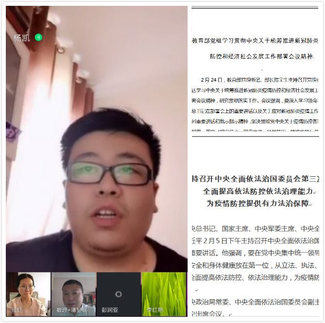 党总支副书记杨凯同志领读了《习近平在中央全面依法治国委员会第三次会议时的重要讲话精神》。根据文件指示,疫情防控正处于关键时期,依法科学有序防控至关重要。在法治轨道上统筹推进各项防控工作,保障疫情防控工作顺利开展。与此同时,杨凯提出要发挥党员的先锋作用,尤其是辅导员和学生党员做好标杆,尊法守法、不信谣不传谣,随时关注学生们朋友圈、QQ空间等发表的言论,引导学生们正确看待问题。持续保持抗疫状态,疫情结束后也要坚持良好卫生习惯。