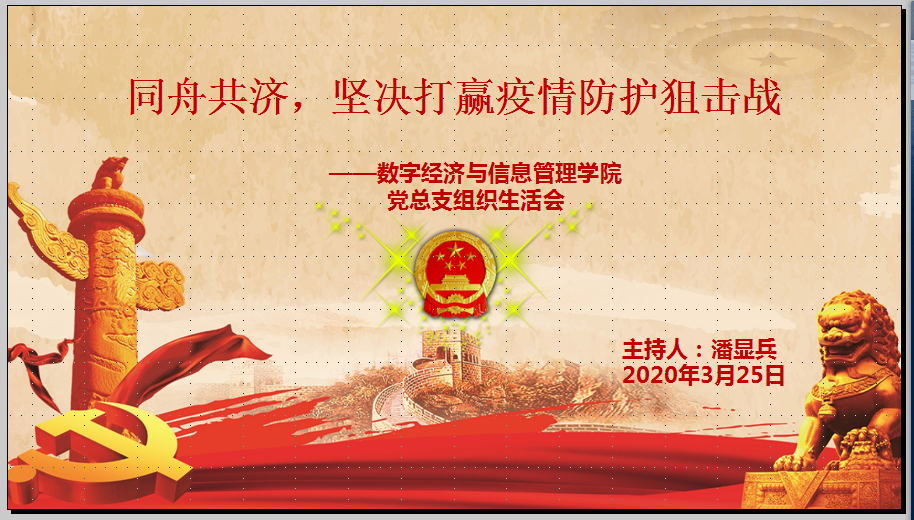 为了学习贯彻习近平总书记对防控新型冠状病毒感染肺炎疫情的一系列重要指示精神,切实发挥党员先锋模范作用和党支部战斗堡垒作用。根据校党委组织部要求,数字经济与信息管理学院党总支于3月25日顺利召开组织生活会。会议由党总支书记潘显兵同志主持,学院全体教职工党员参加会议。