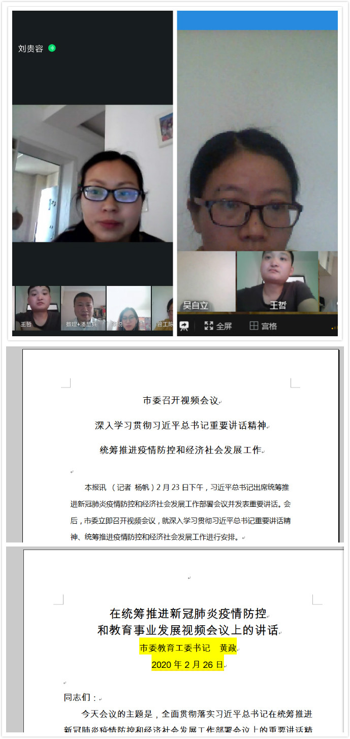 党员同志陈明燕老师领读了《黄政在统筹推进新冠肺炎疫情防控和教育事业发展视频会议上的讲话》。会议提出首先要全面学习贯彻落实习近平总书记的重要讲话精神。二是毫不松懈地抓紧抓实抓细疫情防控工作。三是统筹推进教育事业改革发展稳定各项工作。四是加强党对统筹推进疫情防控和教育事业的领导。陈老师表示作为教师党员在做好教学工作的同时要通过有效的方式,引导学生、家长调整好心态,以高度的政治自觉,继续坚持“疫情面前,居家就是做贡献”的理念,坚守居家学习生活,少外出、不聚集、不添乱。