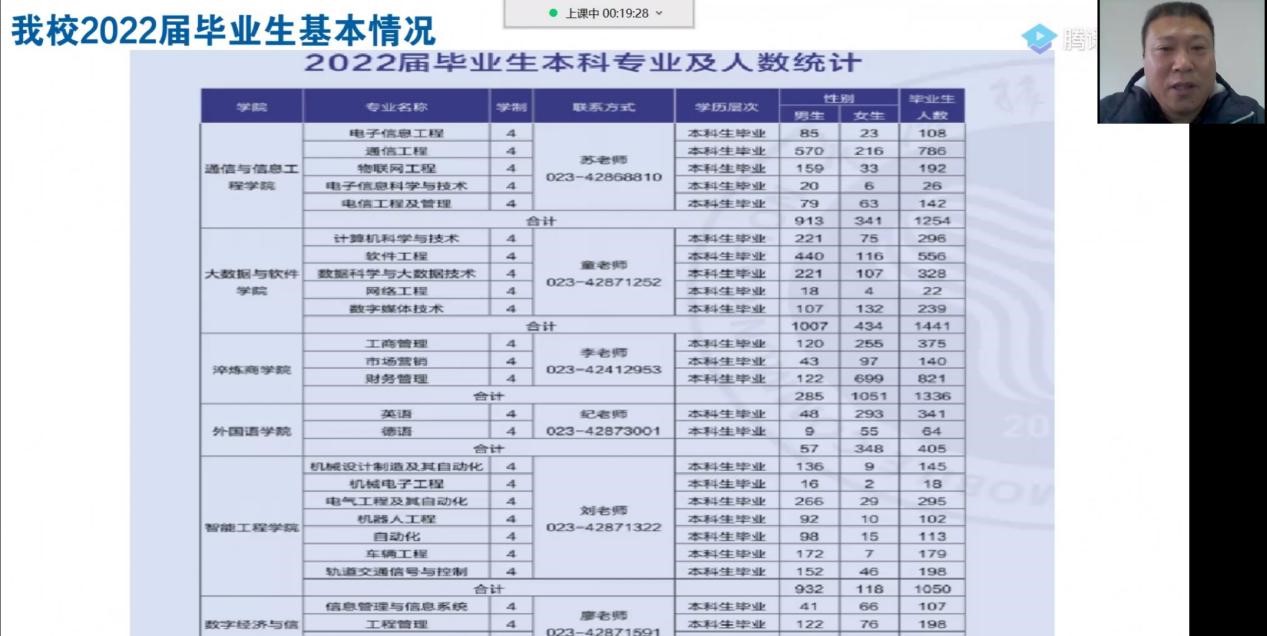 为进一步加强同学们对当今就业形势的认识,帮助广大学生树立正确的就业观念,提升毕业生的就业能力,数字经济与信息管理学院于11月3日下午,以线上直播形式开展2022届毕业生就业创业形势分析报告会。数字经济与信息管理学院院长潘显兵教授作为担任主讲人,副院长刘贵容教授、副院长任瑞娟院长以及2022届毕业班辅导员廖阳老师、曹文扬老师为2022届毕业生就当前疫情之下的就业创业形势答疑解惑。此次分析报告会还邀请到了部分学生家长参会,共同了解当前就业形势,助力学生更好就业创业。