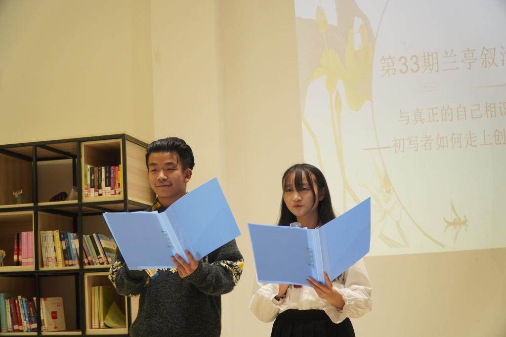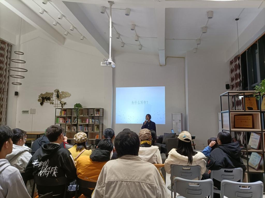 2020年11月21日晚,在秋意阑珊的D区天渠书院,重庆邮电大学移通学院创意写作团邀请“95后”作家、山西文学院签约作家、创意写作学院作家岗教师郭玉瑞老师,为热爱文学的全校学生举办了一场关于《初写者如何走上创作之路》的文学指导讲座。此次讲座是创意写作团自成立八年来一直坚持的品牌文学活动“兰亭叙”系列活动之一,本次讲座是第33期。