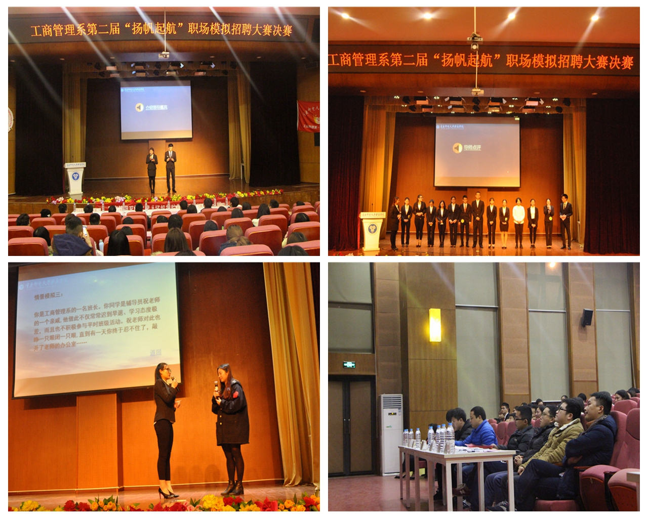 对于不少大学生来说职场似乎是一个陌生而又充满挑战的地方,看着昔日的同学走入职场并且小有成就,很多同学是否已经心急了呢?2016年12月12日19点30分,工商管理系第二届“扬帆起航”职场模拟招聘大赛决赛在下里巴人剧场成功举行。
