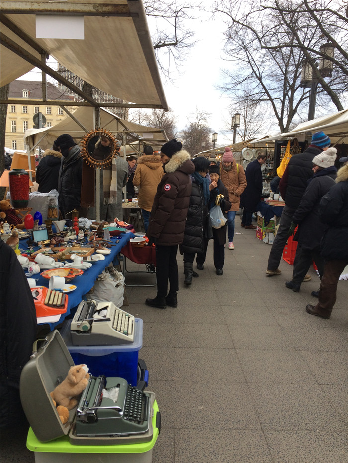 缓缓步行于人潮中,感受着游客以及当地民众对于跳蚤市场的热衷。有趣的一件事发生了,在路过一个即将收拾离开的摊位时,一个德国老太太喊住了我,让我帮她照看摊位,她要去趟厕所。还没等我回复,她就飞快地离开了。看着摊位上还遗留的些许商品和老太的皮包,我心中对于德国人的传统印象不禁又有了摇摆,这样心大的老板,在国内也不多见啊。不过最后还是默认了静静在老太的摊位上等待她回来。