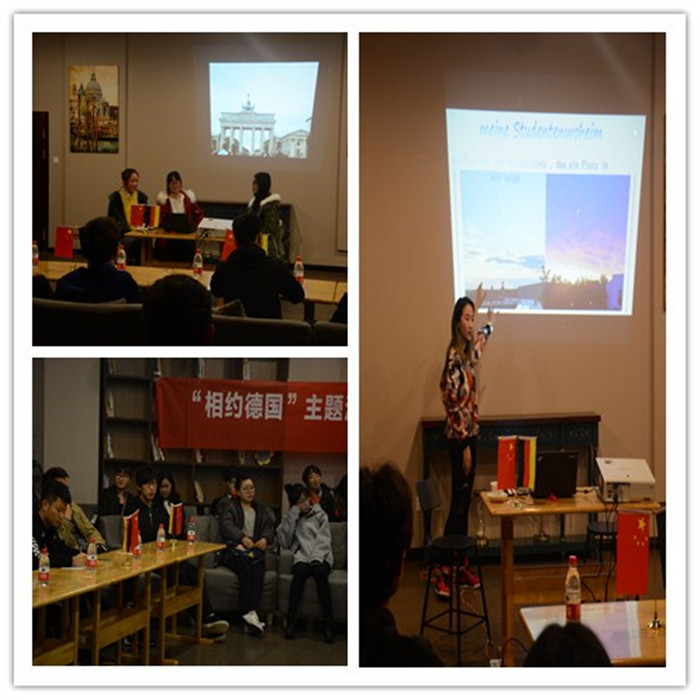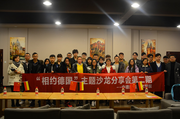 12月15日晚19:00,第二期“相约德国”主题沙龙分享会在咖啡厅如约举行,来自中德学院2015级的周晏旭、张智岚、任佳、胡明霞等几位学姐为在座2016级的学弟学妹们分享了今年暑期去往德国游学的美好回忆,并告诫同学们在大学期间树立远大目标,在思想上要做巨人,在行动上要做铁人,一步一个脚印,踏踏实实掌握好语言,为迎接属于自己的灿烂人生做好准备。
