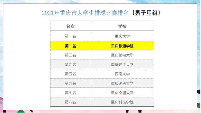 附:2021年重庆市大学生排球比赛排名(男子甲组)