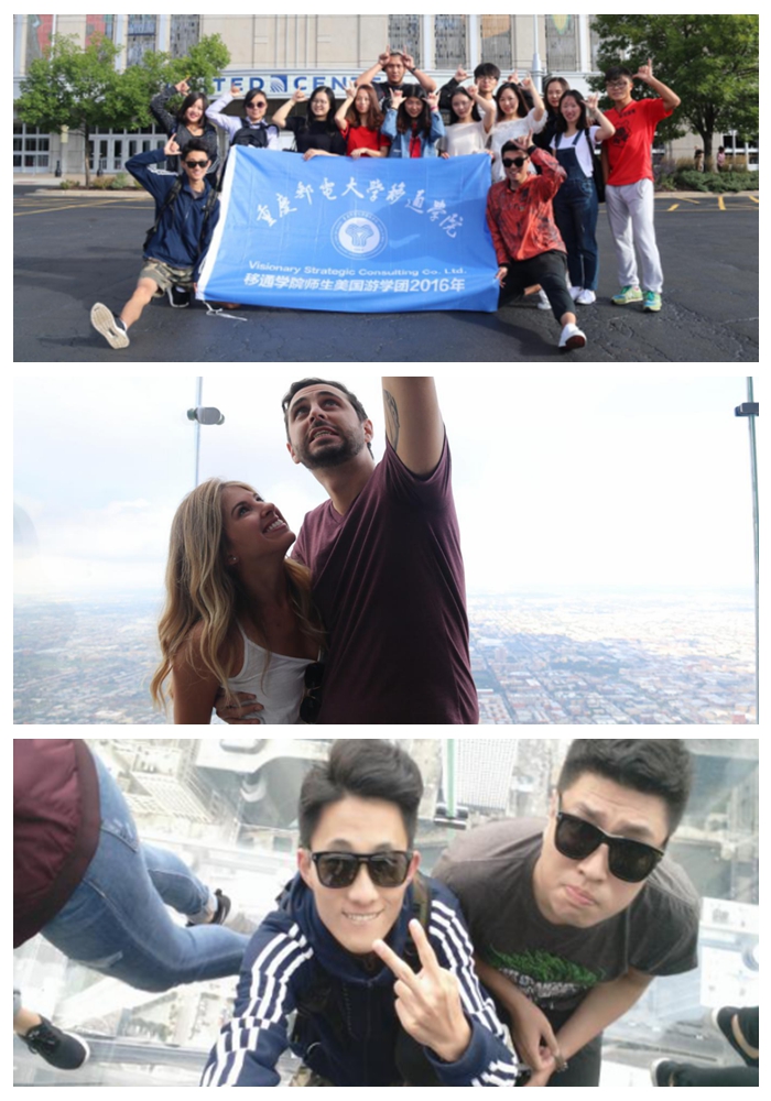 随后我们来到了西尔斯大厦(英语:Willis Tower),又译为韦莱集团大厦,是位于美国伊利诺伊州芝加哥的一幢摩天大楼,曾是北美第一高楼,2013年11月12日被世贸中心一号楼打破记录。落成时名为西尔斯大厦,2009年,总部在伦敦的保险经纪公司-韦莱集团,西尔斯大厦有110层,一度是世界上最高的办公楼。每天约的1.65万人到这里上班。在第103层有一个供观光者俯瞰全市用的观望台。它距地面442米,天气晴朗时可以看到美国的4个州.进入大楼我们在影厅观看了关于这座大楼关于这座城市的历史文化。随后我们搭乘高速电梯来到了顶层观光层,透过巨大的玻璃窗芝加哥的全景还有密歇根湖的全景一览无余。在观赏窗外的景色之余我们团队还遇到了一群乌克兰的美女,虽然语言不通,一句How are you,一个微笑足以表达我们内心的喜悦,遇到他们也是我们此次芝加哥观光靓丽的风景。