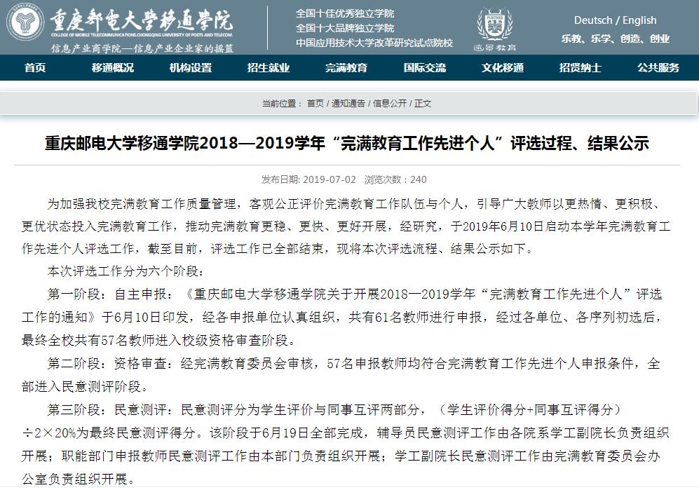 7月2日,完满教育委员会召开委员会议,针对申报人各阶段得分情况进行综合评议最终共评选出2018—2019学年完满教育工作先进个人40名,其中一等奖8名,二等奖32名,具体名单在官网及完满教育官方微信公众平台“移通晓英才”上进行了为期3天的公示,现公示阶段已结束,公示期间无异议或其他特殊情况,获奖者激励奖金将于下学期开学后报经学校行政办公会审议后发放。