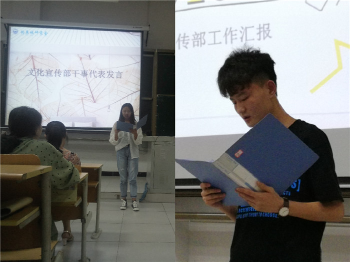 在文化宣传部干事代表向丹的发言中也体现出文宣工作的繁琐,但她也表示作为文宣人就应该吃得苦,迎着上。文宣的工作不同于其他部门,主要是进行对外宣传,突显社团活跃程度,是一各团体的形象的塑造者。同时她还表示,在文宣工作的这一年她的收获匪浅,“星光不问赶路人,时光不负有心人”,只要肯学就一定有收获。